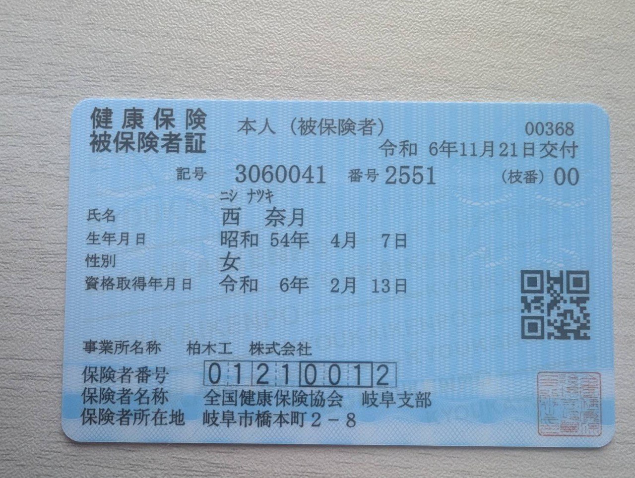 本人口座:飛騨信用組合 中山支店 0803318 ニシナツキ